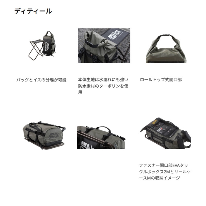 【アブガルシア/Abu Garcia】取り外し式の折りたたみチェア付属で釣りのベース基地として使用できる移動もラクなダッフル型のバックパック[BASE DUFFLE BAG]