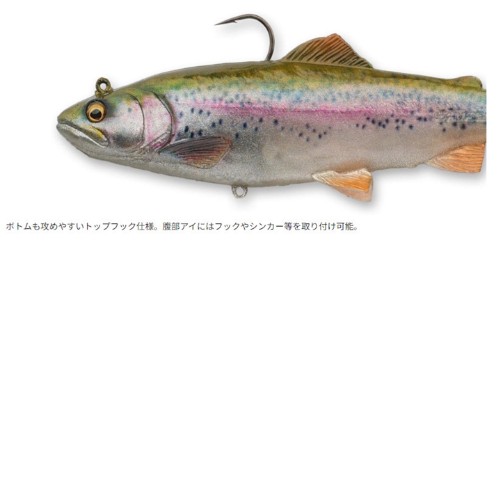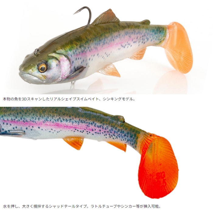 【サベージギア/SAVAGE GEAR】本物の魚を3Dスキャンしたリアルシェイプスイムベイト、シンキングモデル。水を押し、大きく攪拌するシャッドテールタイプ。ラトルチューブやシンカー等が挿入可能。ボトムも攻めやすいトップフック仕様。腹部アイにはフックやシンカー等を取り付け可能。[3D Real Trout S]