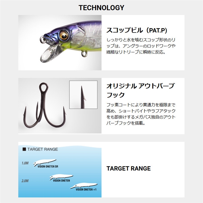 【メガバス/Megabass】『KING OF JERKBAIT』として、世界で活躍するビジョン・ワンテンシリーズのシャローモデルがワンテンSR。最大潜行深度1.0mのワンテンSRは、リールハンドルのノブに指をかけた瞬間から、着水同時にアクションが即立ち上がり、着水地点のバイトも誘発。オリジナルワンテンよりも最大深度を抑え、左右へのダート距離を拡大化。ロッドアクションのワンストロークで移動可能な水中のダート距離は、ワンテン随一のものです。なお、ロッドを立て、ラインスラックの瞬時の緩急によるショートストローク・トウィッチでは、水面に向かう「ライズ アップ軌道」、腹部をひるがえす「ロール・フラッタリング」、「フラッタリング&ダート」など、アクロバット・アクションを多発させます。ワンテンSRにはメガバス独自のアウトバーブフックを搭載。フッ素コートにより貫通力を極限まで高め、いかなる角度からのショートバイトやラフアタックをも即掛けする、ハイスコアゲームを追求したコンペティティブな仕様です。[ヴィジョン][25new16]
