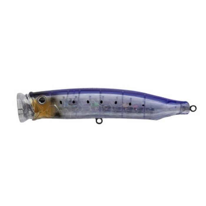 主なターゲットは、ヒラマサをはじめとするオフショアの青物。連続したショートジャークで、水面直下を、泡をまとってウォブリングで泳ぎます。テール部分にウェイトを集中させ、浮き姿勢はほぼ垂直。連続ジャーク後の僅かなステイでも一度しっかり水面に顔を出しテンポよい釣りが可能です。さらにR-Unit2.0Revolverを搭載して、波間に漂う時も決して水と同調する事なく、ステイ時にも生命感を追求しました。ポッパーともダイビングペンシルとも違う個性を持ったプラグです。