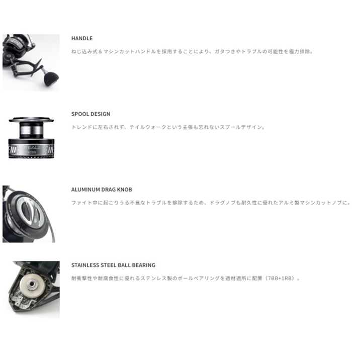 【エイテック/A-TEC】「剛性を以て、至強へ」パワフル&タフネスを極めたスピニングリールの誕生。近海といえどもターゲットの大型化が当たり前となってきている昨今。マグロ・ヒラマサ・GT・ブリ・カツオ・シイラ・・、巨大なスプリンターたちの猛烈なダッシュを体感するチャンスは以前と比べて倍増している。加えて、ショアジギングやロックショアといった過酷な状況下でタックルを酷使するショアアングラーたちからあがる大型スピニングリールへのニーズも見逃せない。「そこで機能するタフなスピニングリールが欲しい・・」アングラーたちのシビアな要望に応える質実剛健なスピニングリールが誕生、その名はSTEALZ(ステルス)。「最後まで巻き上げる」ことをテーマに開発された同機は、ハードユースに耐え、惜しげもなく酷使できることを優先。テイルウォークリール[らしさ]を随所に散りばめた。ボディ&ローターには強度に優れたアルミニウムマテリアルを採用し、不意な大物にも屈しない強靭さを獲得。スプールに刻まれたパターンと、そこから覗く硬質なテクスチャーが、内包された強さを無骨に表現する。また、ドラグワッシャーは耐久性が高く、耐熱性にも優れたカーボンワッシャーとすることで、激しいファイトを征することができる仕様に。加えて、リールの心臓部ともいえるメインドライブギア&ピニオンギア、さらにはドライブシャフトにも高剛性のステンレスマテリアルを採用。オフショア&ショアソルトゲームをくまなく知るテイルウォークならではの仕様となっている。オフショアキャスティング、ジギング、ショアジギング、ロックショアといった、ありとあらゆるゲームに対応。アングラーたちの血肉を滾らせるビッグファイト・・『その瞬間』に最大限の機能を発揮するスピニングリールとなっている。[STEALZ]