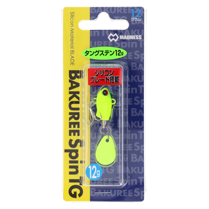 【マドネスジャパン/MADNESS JAPAN】ソフトな触感のシリコン製ブレードを搭載したバクリースピンTG12。小粒ながら十分のウェイトとベストなボディバランスで抜群のキャスタビリティーを誇ります。ボディ形状とシリコンブレードの効果で浮き上がりにくく一定レンジを長くトレースでき、リトリーブでの立ち上がりも早く安定したフォールバランスでよりセレクティブなターゲットをバイトに持ち込みます。適度な柔らかさのシリコン製ブレードが不規則に回転することで食わせの間を作り出し、デイゲーム最強の銀粉シリコンブレードを搭載。サイレント&ベイトライクな波動がメバル、アジは勿論、シーバス・カサゴ・メッキ・カマス・キジハタ・ヒラメ・鯛・トラウト・ブラックバスにも抜群の効果を発揮します。