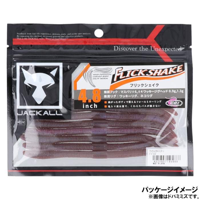 【ジャッカル/JACKALL】『The Origin/常識を覆した永遠のヒットルアー』。国内外問わず様々なフィールドで実績を残すフリックシェイク。ストレートワームにあえてカーブをつけるというコンセプトから生まれる複雑で艶めかしいロールの効いたアクションでバスを魅了します。シェイク時はもちろん、フォール中は両端から生まれる微波動はさらにアピール力を増し、神経質なビッグバスのバイトを誘発します。[Flick Shake]
