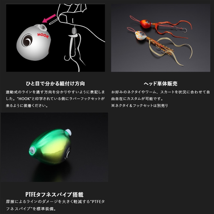【ジャッカル/JACKALL】ドテラ・キャスティングに最適。斜め引きをした際の浮き上がりを重視した雷流ヘッドNEOは、ドテラ流しやキャスティングタイラバでより多くのリフト&フォールを可能にし、バイトチャンスを増やします。高比重タングステン素材により、コンパクトなシルエットと素早い沈下を実現。また、タングステンは硬度も高いため、着底の瞬間や底質の変化などのあらゆる情報をユーザーまで届けます。さらに、軽い巻き抵抗により、小さなバイトや僅かな潮流の変化も感じ取ることができます。[TG BINBIN DAMA SLIDE RAIRYUHEAD NEO][22new16]