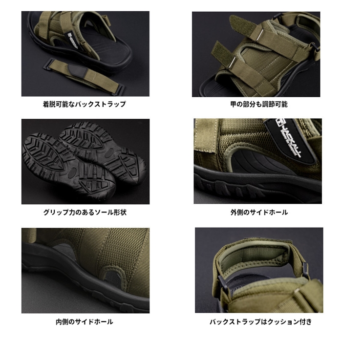 【ジャッカル/JACKALL】フィッシングシーンはもちろん、アウトドアやタウンユースにも大活躍の機能的かつスタイリッシュなサンダルが登場。タクティカルサンダルの最大の特徴は着脱可能のバックストラップ。その日の気分や用途に応じてバックストラップを着脱可能な2WAY仕様で、釣行時や着用時の安定感が必要な時にはストラップを装着していただき、リラックスしたい時には取り外して脱ぎ履きの楽な仕様にすることができます。機能的かつコーディネートの幅も広げることができ、夏をより快適にお洒落に楽しんでいただけます。※バックストラップを装着される際は、必ずストラップが固定されたことを確認してご着用ください。[TACTICAL SANDAL][22new04][23selling05]