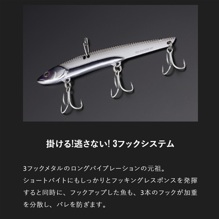 【ジャッカル/JACKALL】カタクチイワシ等にマッチした107を基準に、浅場やキビナゴ等の小型ベイトパターンには80、深場狙いや遠投が必要な場合は107HW、コノシロやマイワシ等の大型ベイトパターンには128が最適です。特徴的なスリムロングボディは、高いアピール力とベイトフィッシュに近いシルエットを兼ね備える。シーバス、ブリ、サワラ、ヒラメなどに高い実績を誇る定番バイブレーションです。[BIGBACKER]