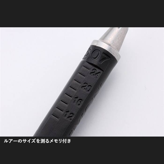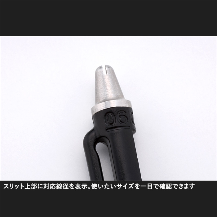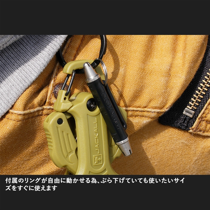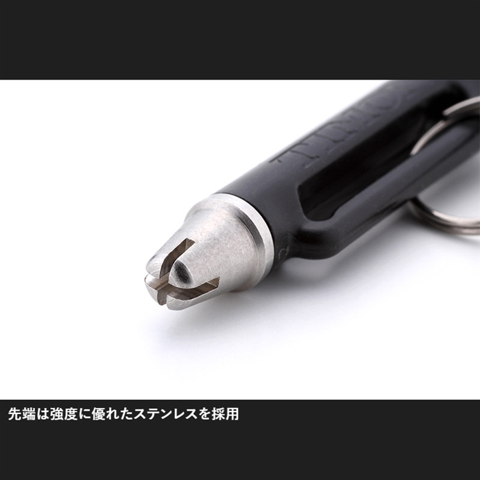 【ジャッカル/JACKALL】ルアーが左右に泳いでしまうとルアーの性能が100%引き出せない為、必須になるのがアイチューナーです。浮上系ミノーのブームにより誰もが行うようになったアイチューンですが、使いたいときに使いたいサイズがないと言ったわずらわしさがありました。しかし、このTIMONアイチューナーは0.6mm・0.7mm・0.8mm・1.0mmとエリアトラウトで使われているアイの線径にマッチしており、また、スリット上部には対応線径を表示しているため使いたい線径が一目で分かるようになっています。持ち手にはルアーのサイズが測れる目盛りがついており、使用したいルアーが釣り場さんのレギュレーションに対応しているか瞬時に計測可能。また、リングが付属しておりぶら下げていても邪魔になりにくい設計になっています。[TIMON EYE TUNER]
