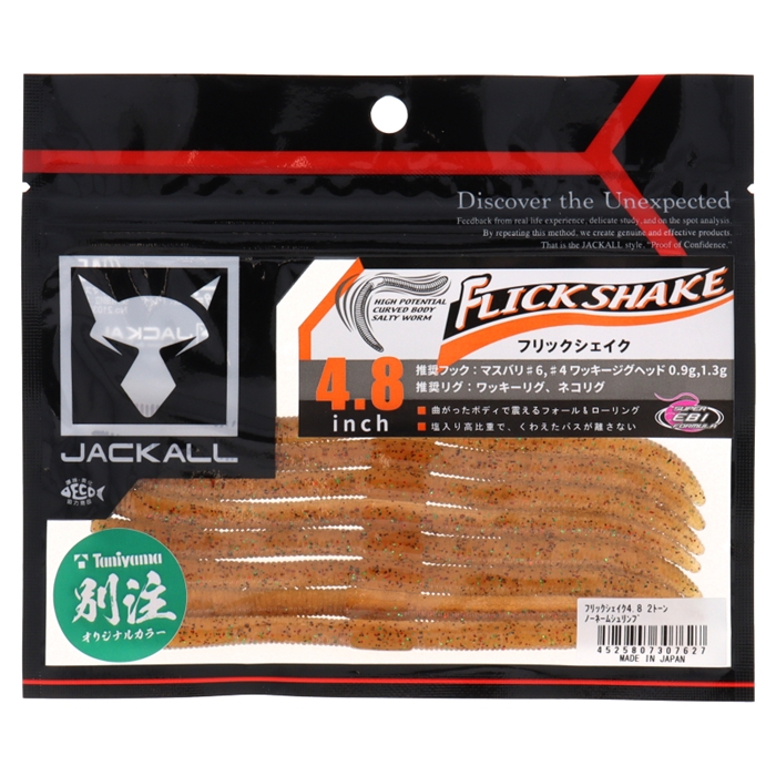【ジャッカル/JACKALL】国内外問わず様々なフィールドで実績を残すフリックシェイク。ストレートワームにあえてカーブをつけるというコンセプトから生まれる複雑で艶めかしいロールの効いたアクションでバスを魅了します。シェイク時はもちろん、フォール中は両端から生まれる微波動はさらにアピール力を増し、神経質なビッグバスのバイトを誘発します。[Flick Shake]