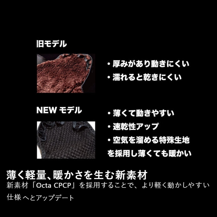 【ジャッカル/JACKALL】暖かさはそのままに可動域をに向上した防風リストウォーマー。従来品からよりフィッシングシーンに合わせたアップデート。従来品はその暖かさで好評をいただいていましたが、毛足の長いボアによる厚みで「手首の可動域が制限される」「濡れると乾きにくい」という課題がありました。新しい「ウインドブロックボアリストウォーマー」では、内側生地に先進素材 Octaを採用。Octaは中空の独自断面構造を持つ繊維を使用しており、軽量でありながら高い保温力と優れた速乾性を兼備。空気を多く含むことで暖かさをキープしつつ、汗や水分を素早く外に逃がすため、濡れても乾きやすく快適性を維持します。その結果、厚みを抑えて手首の動きを妨げにくく、従来の防風性・保温性に加え「動かしやすさ」と「乾きやすさ」を兼ね備えたアップデートモデルに進化しました。手のひら部分はフルオープン仕様で直接ロッドやリールに触れることで、いつものフィーリングと感度で釣りをすることが可能です。[WINDBLOCK BOA WRIST WARMER GL-A003]