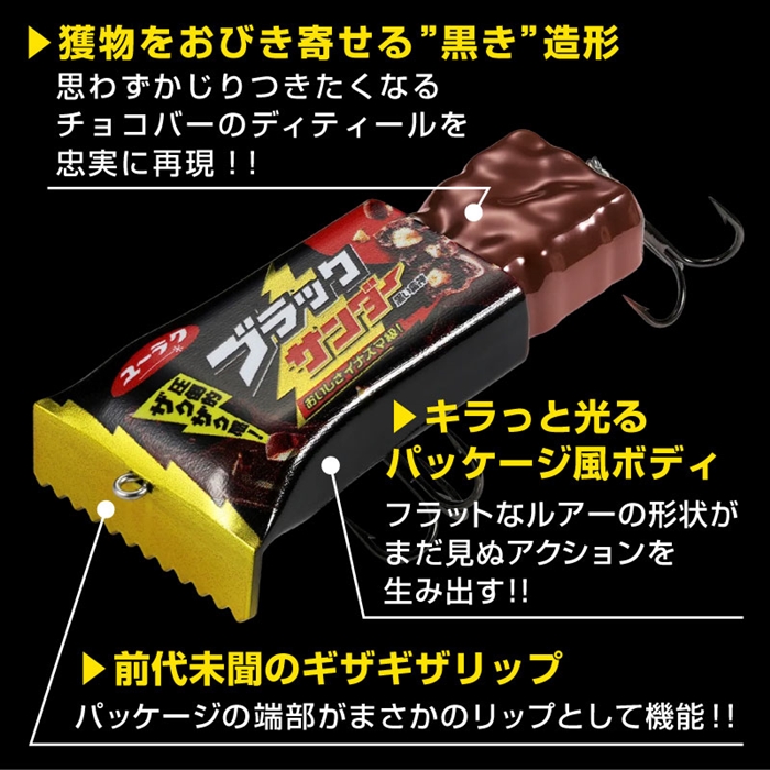 【デュオ/DUO】DUOと有楽製菓の異色のコラボにより、『魚が食いつくブラックサンダー』が誕生。このルアーは、『ブラックサンダーの忠実な再現』と、『圧倒的な機能の追求』を実現した前代未聞の逸品である。まるで本物のブラックサンダーのようなボディを活かし、獲物をザクザク狙え。さぁ、イナズマ級に刺激的な釣りを体感しよう!![ユーラク][blackthunder][26new16]