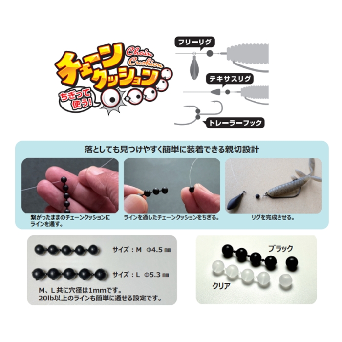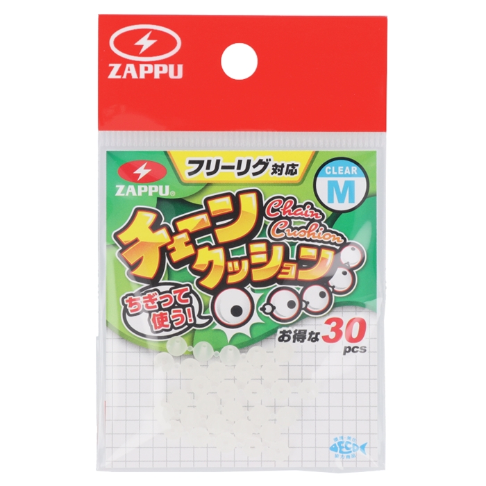 【ザップ/ZAPPU】ZAPPU 「CHAIN CUSHION(チェーンクッション)」は、近年注目されているフリーリグをはじめ、テキサスリグやキャロライナリグなど、遊動ウェイトのリグを使用する際に気になるシンカーによるノット(結び目)の損傷を抑えるクッションパーツです。多くのアングラーが経験する、装着時に落としてしまって紛失することを低減するため5個のクッションを繋げて成型しました。落としても見つけやすく簡単にちぎって使えます。その他、トレーラーフックの固定やワームフックのワームキーパーとしても使える便利なパーツです。