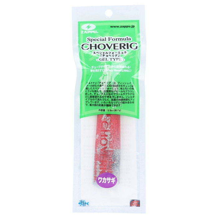 【ザップ/ZAPPU】ダウザー俺達。こと秦拓馬プロのプロデュースのスペシャルフォーミュラ。ZAPPU「CHOVERIG (チョベリグ)」は、フィッシュイーターの好む小魚やエビの抽出成分をギュッと凝縮したスペシャルフォーミュラです。味と匂いの他にラメも加えて視覚的なアピールもプラスしました。便利なチューブ入りなのでワームやプラグなどに直接塗れて手を汚しません。ジェルタイプなので流れづらく、効果の持続時間もアップしています。いろいろなリグとの組み合わせて、最大限の釣果が期待できます![CHOVERIG GEL TYPE]