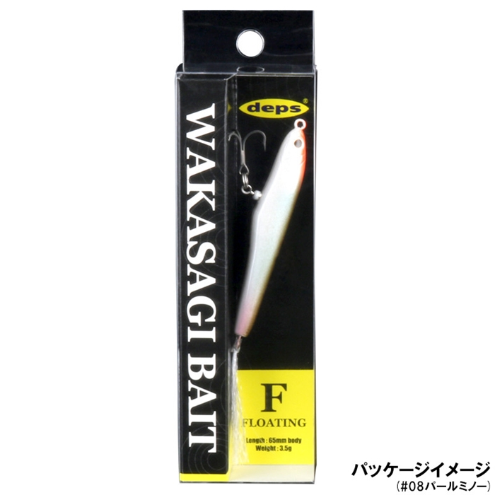 【デプス/deps】マッチ・ザ・ワカサギ。『ワカサギベイト』は、独特なボディシェイプにより、ベイトフィッシュが逃げ惑うようなパニックアクションを繰り出せる、i字系リップレスミノーです。綺麗な引き波を生み、安定したi字アクションをみせるフローティングモデルは、水面を漂わすデッドスティッキングでもバスを呼び寄せる高い集魚力を持ちながら、ひとたびロッドアクションを加えるとベイトフィッシュが捕食者に襲われ慌てふためくような水紋を作り出します。また凹凸を極力無くしダート幅を広げた低抵抗ボディにより、水面を飛び出すようなパニックアクションでバスの興味を上へと向け、バイトへと持ち込ませてくれます。このパニックアクションは水面下を狙えるシンキングモデルでも、ベイトフィッシュが逃げ惑う予測不能なダートアクションでバイトへと導いてくれます。[WAKASAGI BAIT]