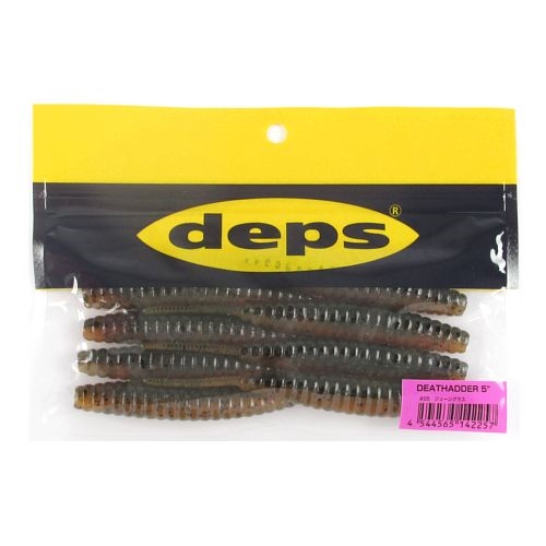 【デプス/deps】デビュー以来、桁違いとも言える数のビックバスを仕留めてきた実績と、誰にでもビッグバスをもたらしてくれるという圧倒的な威力でソフトベイト新時代を築き上げてきた「デスアダー」シリーズ。水流を身にまとうボディーフォルムと、急激に細められたテールが生むリアルなタイトバイブレーションは、ミノーイーター化したビックバス達に違和感なく口を使わせる爆発的釣果を叩き出しています。いまや定番とも言える「デスアダー」の高い順応性は、ノーシンカー、ジグヘッドリグ、テキサスリグだけでなく、ワッキーリグやダウンショットリグ、スピナーベイト・トレーラーなど、あらゆる用途において高い実釣性能を発揮してくれます。