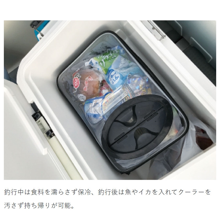 【がまかつ/Gamakatsu】弁当や飲み物を入れておけば、同じクーラーに入っている魚の匂いや汚れから守ってくれます。成形投入口を採用し、ワンタッチで食料・魚を投入可能!!35リットルサイズのクーラーでの使用に最適です。