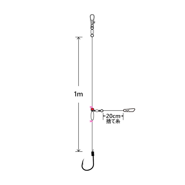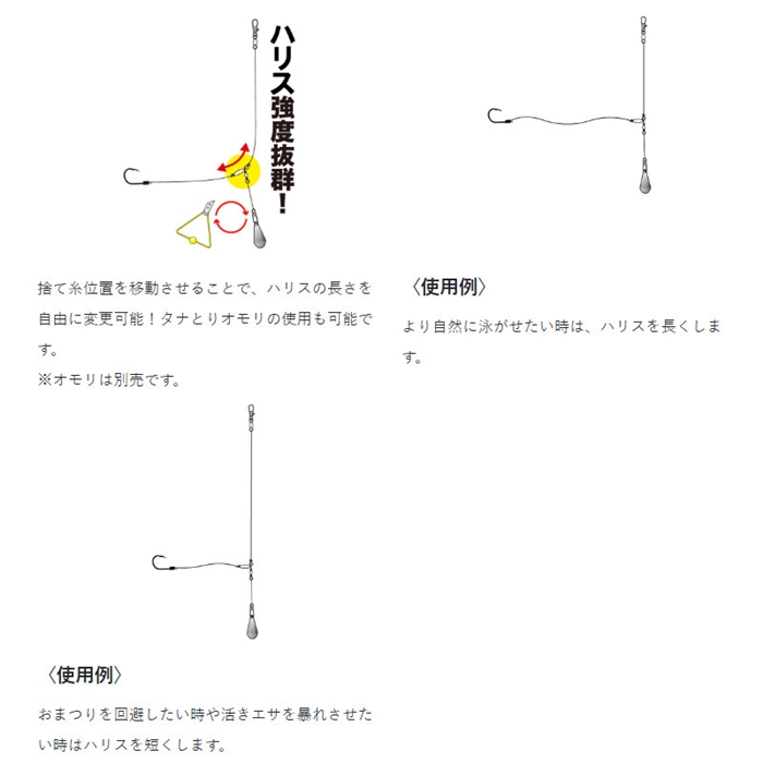 【がまかつ/Gamakatsu】1mのハリスにオモリを付ける枝を付けることにより、ハリスによるクッション性が上がり、青物の急激な突っ込みにも耐えられるハリス強度を保てます。また、枝位置を動かせるので鈎-枝までの距離を好みの長さに調節できます。