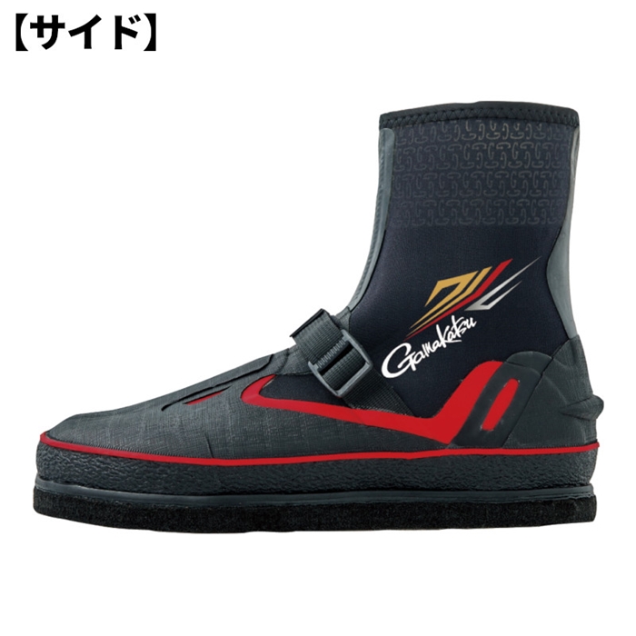 【がまかつ/Gamakatsu】足部分を保護するラバーガード構造。後部にラバーを横断させることによりタビ内での足の遊びを軽減。タビ底を柔らかくすることにより、反りが良くなり、川底への食いつきがアップ。反り返りを邪魔しない靴底はクロロプレンクッションを内蔵。