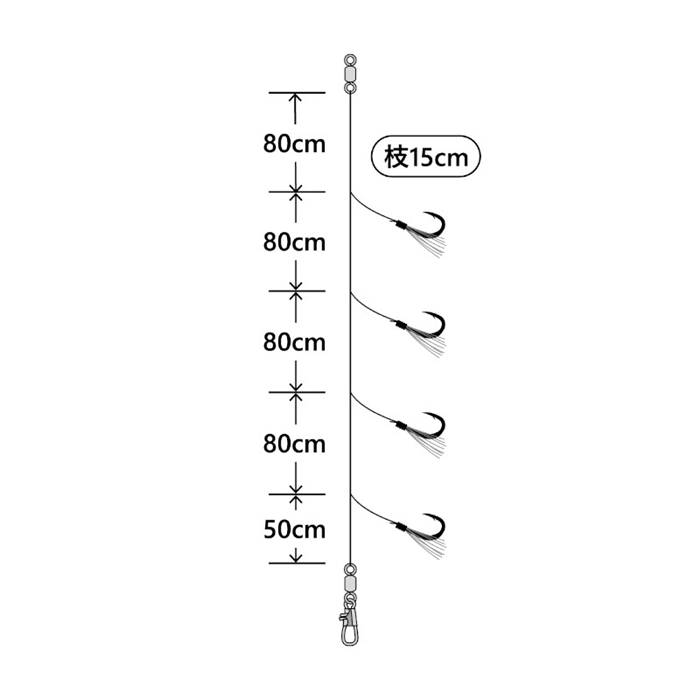 【がまかつ/Gamakatsu】下向きに出した枝が落し込む際に広がり、ベイトの乗りを誘発。またハリスが折れ曲がらずに結節強度の低下を押さえます。長めのハリス・広めの枝間がターゲットの警戒心を解き口を使わせます。4本鈎仕様で広くとった枝間は、危険な取り込み時のトラブルを軽減します。カラ鈎仕様とファイバー仕様を状況に応じて使い分けください。