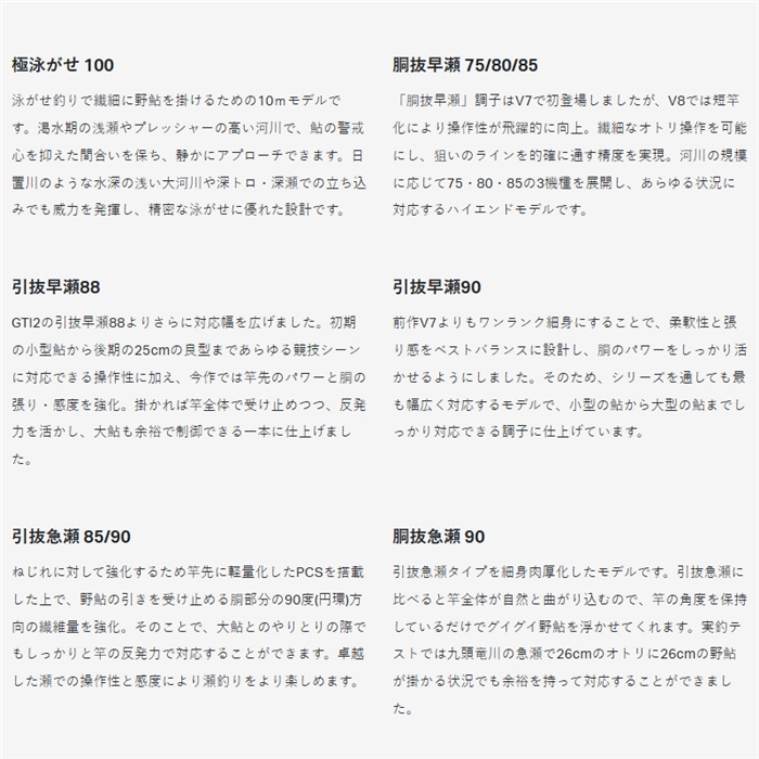 【がまかつ/Gamakatsu】がま鮎の競技系ロッドのハイエンドシリーズ。5タイプの調子を揃え、幅広い状況に対応します。高強度高弾性カーボンTORAYCA(R)M40Xの採用で軽量化と破損防止を両立。標準穂先はカーボンチューブラーで、極泳がせと胴抜早瀬には繊細タイプ、引抜早瀬と引抜急瀬と胴抜急瀬には万能タイプのチタン替穂先、さらに初期の小型の時期や積極的にオトリを動かしたいときに最適なS3ソリッド替穂も全機種に付属。引抜急瀬・胴抜急瀬は軽量でねじれに強いPCS搭載で操作性と感度を強化。各モデルは繊細な泳がせ釣りに適した極泳がせ100から、大型鮎対応の引抜早瀬、急瀬対応の胴抜急瀬まで多彩にラインナップ。競技の新たな可能性を切り拓くため、すべての機種において、トーナメントシーンの最前線で活躍するがまかつテスター陣が調子設計にこだわり抜いた完成度の高い逸品です。(がまあゆ きょうぎスペシャル ブイエイト)