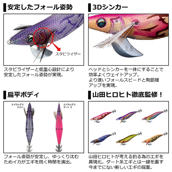 山田ヒロヒト徹底監修!ぶっ飛び非ダート系エギ。山田ヒロヒトが考える釣る為のエギを具現化。高重量と独特のボディー形状により想像を超えた飛距離を実現した。さらに、スタビライザーと低重心設計により揺ぎない安定感を実現。圧倒的な飛距離、安定したフォールがもたらす相乗効果で今まで捕れなかったイカを狙い打ち。ダート系エギとは一線を画す今までにない新しいエギの提案。[EMERALDAS STAY]