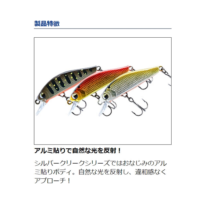 シルバークリークミノースローフォールカスタムの特徴はゆっくり沈むスローシンキングにより時間をかけた繊細なアプローチを可能にしをかけ誘い、且つ、見切らせないキレのあるアクションを演出し続けられるかどうかが大切である。そのためスローフォールカスタムのアクションはウォブリングとヒラウチを半々で融合しスローに誘いながらも見切らせない動きを実現している。ボディーはファットボディーを採用し、視認性、操作性を保ちつつも40mmという小型のサイズ感で繊細にアプローチができる。ハイプレッシャー河川が増える今、渓流ミノーイングに『スローフォール』という新しいスタイルをお届けしたい。[SILVER CREEK MINNOW SLOW FALL CUSTOM 40SS]
