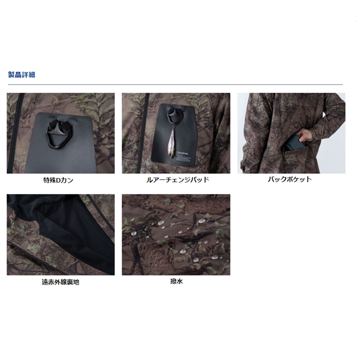 遠赤外線効果で暖かいフィッシングジャケット。1枚羽織れば手ぶらで釣行可能。表地は撥水、裏地には遠赤外線効果のある素材を採用し、冬でも暖かく、快適な釣行が可能。ルアーチェンジパッドを搭載し、ルアー交換の際、ルアーの一時保管用として引っかけておくことが可能。ケースからルアーを選ぶ際や、リーダーを結ぶ際等、置き場所に困るときに便利。特殊な形状のDカンはフックが引っ掛かりやすく、外れにくいように設計。パッド部分はフックが突き刺さりにくい素材を採用。本体生地はストレッチ性に優れ、ストレスのない動きが可能。ファスナー付きポケット2カ所と背面にはマルチケース205MJがぴったりと入るポケットを搭載。