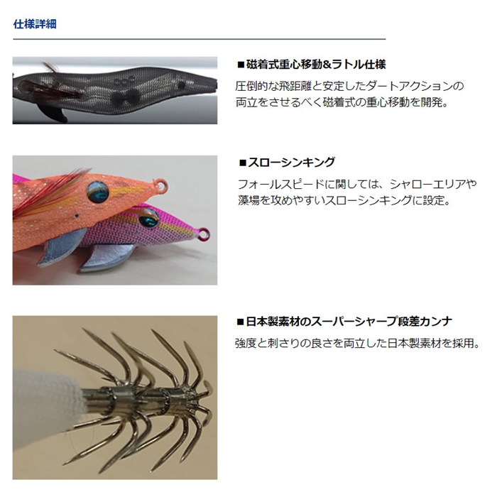 安定したフォール姿勢で定評のあるエメラルダスフォールが重心移動を搭載して新登場。ボリューム感のあるボディーにより水中でのフォール姿勢が安定しスレたイカに警戒心を与えにくい。磁着式重心移動を搭載したことで飛距離が飛躍的に向上。着水しフォールに移行すれば、しっかりと磁石がウェイトを固定するので安定したフォール姿勢をキープ。ラトルタイプとなっておりシャクリ時は広範囲にアピール。[EMERALDAS FALL LC RATTLE TYPE S]