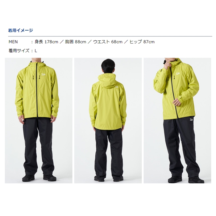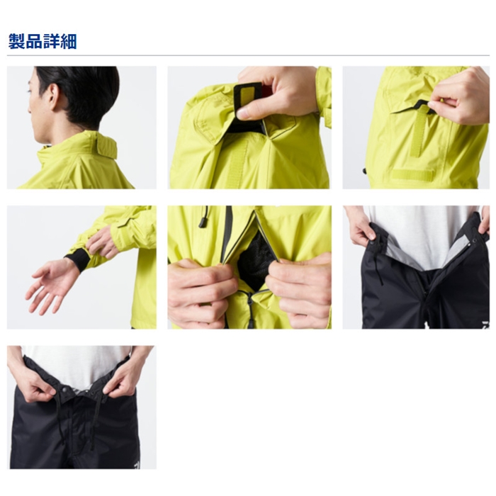 動きの多いジャケットにはしなやかなレインマックス2層素材、耐久性が必要とされるパンツにはレインマックス3層素材を採用したハイブリッドレインスーツ。フードにはビューアップシステムを搭載。フード後方のドローコードを引く事ことで、サイドの視界をグッとアップ。不要時はフードを丸めて束ねておけるロールアップ仕様。袖口は水の浸入を軽減する2重袖口仕様。水の浸入を軽減する止水ファスナーをフロント/ポケットに採用し、衣服内とポケット収納物の濡れを最小限に抑える。パンツのウエストにサイズ調整用コードを装備。ウエストのフィット感を調整可能。フロント/ポケット部から水の浸入を軽減する止水ファスナーを採用。さらにフロントファスナーからの水の浸入を防止する三角マチを搭載。履物に合わせて裾幅を調整可能なブーツカットファスナーを裾部分に搭載。