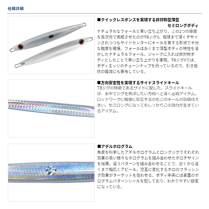 TBジグのアクションを活かしつつ、よりクイックレスポンスでロッドワークに呼応するセミロングバージョン。切れの良いアクションは、ターゲットの捕食スイッチを素早く入れることができ、活性を一気にピークに持ち込むことができる。[SALTIGA TB JIG SEMI LONG ADEL]