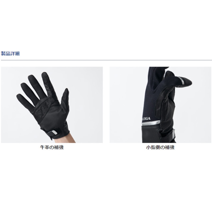 甲側に柔軟性と保温性を併せ持つタイタニュームaを使用。補強部には新素材の牛革を採用。親指も補強することでベイトリールにも対応。リールフットを挟む部分にも、柔らかいタイタニュームaを採用。手首の動きを妨げないショートタイプ。[22new04]