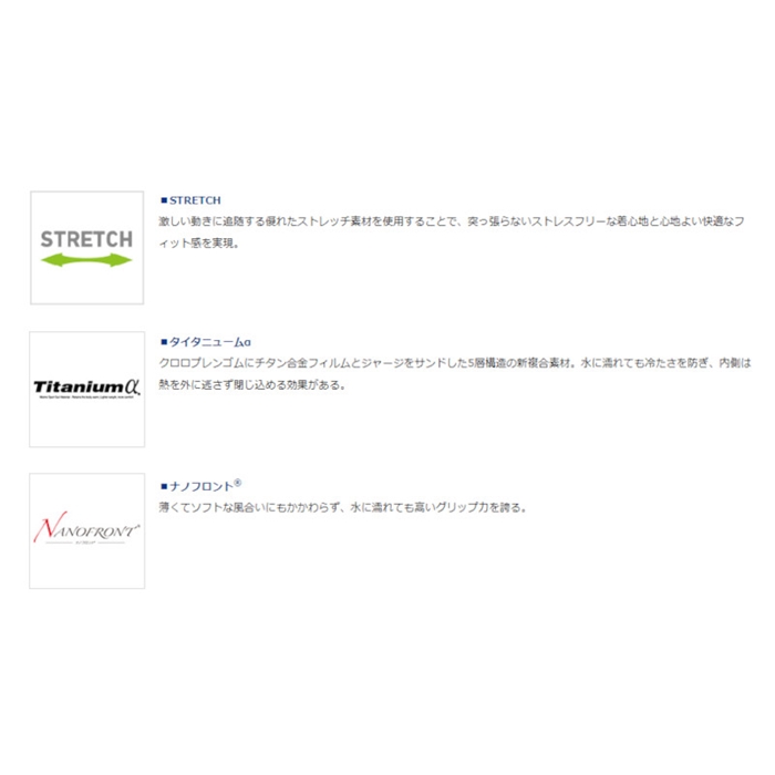 【素材】 甲:本体/クロロプレンゴム(チタン合金加工)、部分/合成皮革、掌:本体/ポリエステル100%、部分/合成皮革、手首:クロロプレンゴム(チタン合金加工)