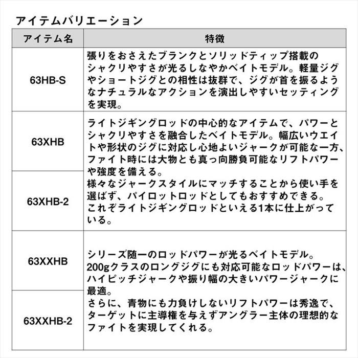 BLAST LJがOUTRAGE BR LJとしてフルモデルチェンジ。ファイト性能と操作性が向上したX45。ジグを暴れさせず食い込み性能が向上するメガトップ穂先(ソリッドモデルのみ)。軽量・高感度・手当たりの良さを追求したエアセンサーシート(SPモデルのみ)。まるでワンピース!Vジョイント(センターカット2PCのみ)。軽量性とパワーの融合のHVF。ワンピースロッドに近い調子を実現可能なバットジョイントと携行性に優れたセンターカット2ピースをラインナップし価格以上のデザインを実現。ライトジギングに求められる性能を高次元で融合したベーシックモデル。ブランクは高密度カーボンHVFをX45でサポートすることで、高感度かつ細身ながら不意の大物にも対応可能なロッドパワーを備える。[OUTRAGE BR LJ][24new01]