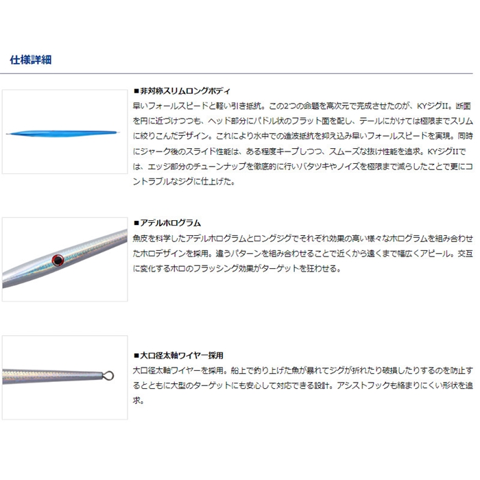 対ヒラマサ攻略スリムロングジグ。九州玄界灘で大政を獲るために開発されたKYジグ。連日攻略され、クレバーになったヒラマサ相手にどのようにすれば口を使わせることができるか?ディープ、急流、ドテラ流しというアングラーにとって非常に過酷な状況下でも、一日を通して安定的なジャークを繰り出すにはどうすれば良いか?の2つの命題に応えるべく更にKYジグの細かい部分をブラッシュアップ。より使いやすいスリムタイプのロングジグとしてアップデートさせたモデル。[SALTIGA KY JIG II ADEL][22new16]