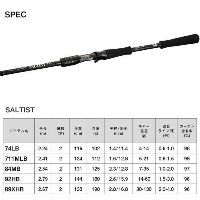 SWルアーベイトロッドのニュースタンダードが誕生。PEライン専用ロッドとして、SALTISTリールと合わせて躊躇なく振り抜ける調子に設定。キャスタビリティを考慮して全てチューブラートップ仕様。74LB/711MLBは、シャープに振り抜ける並継仕様、84MB/92HB/89XHBは、しっかりルアーがバットまで乗せられる逆並継設計仕様。[SALTIST][23new01]
