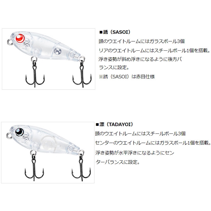 よく飛んでよく泳ぐ。使いやすさを重視した岩崎林太郎監修「月下美人 夕凪」にスモールサイズが登場。浮き姿勢は、斜め浮きタイプの「誘(さそい)」と、水平浮きタイプの「漂(ただよい)」の2タイプ。メバルが小魚を捕食している時は、積極的にメバルを誘うのが有効。タダ巻きで引き波を発生させ、瀕死の小魚を演出したり、リズミカルなドッグウォークやダイブで多彩に誘ったりするのは斜め浮きタイプの「誘」が使いやすい。メバルがアミなどのプランクトンを捕食しているときは、ルアーを動かさず、水面に漂わせるのが有効。潮流に乗せて流しこむ「ドリフト釣法」や水面に浮かしたままにする「ほっとけメソッド」でナチュラルにアピールするには水平浮きタイプの「漂」がオススメ。[GEKKABIJIN YUNAGI][22new16]