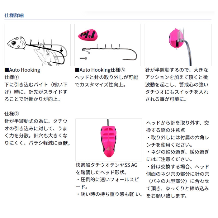 これまでの常識が変わるNEWテクノロジー搭載船タチウオテンヤ。船タチウオテンヤの新時代を切り開く!!これまでにないテクノロジー(1)下に引き込むバイト(喰い下げ)時に、針先がスライドすることで針掛かりが向上。(2)針が半遊動式の為に、タチウオの引き込みに対して、うまく力を分散。針穴も大きくなりにくく、バラシ軽減に貢献。(3)ヘッドと針の取り外しが可能でカスタマイズ性向上。本製品はシングルフックタイプで針の長さはノーマルタイプになります。[FUNE TACHIUO TENYA SS AH][23new16]