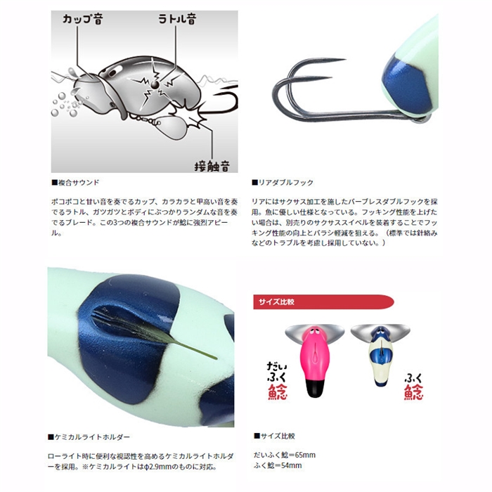 投げて巻くだけ、使って楽しい鯰専用のふくちゃんが登場。着水後のバイトチャンスを高めるため、ドッグウォーク性能にも拘り、ネチネチ誘うことも可能。サウンドは、内蔵ラトル、カップ音、ブレード接触音の3種混合で鯰に強烈アピール。ブレードとフックはオープンヒートンで接続されておりチューニングも楽しめる設計になっている。使い方が簡単で使って楽しいことから、鯰釣りをやってみたいという初心者の方にもオススメできるアイテムとなっている。だいふく鯰は自重が22gあり、太いPEラインを使用する時やオールドタックルで釣りを楽しみたい時にオススメ。非常に投げやすい自重となっている。[FUKU NAMAZU][24new16]