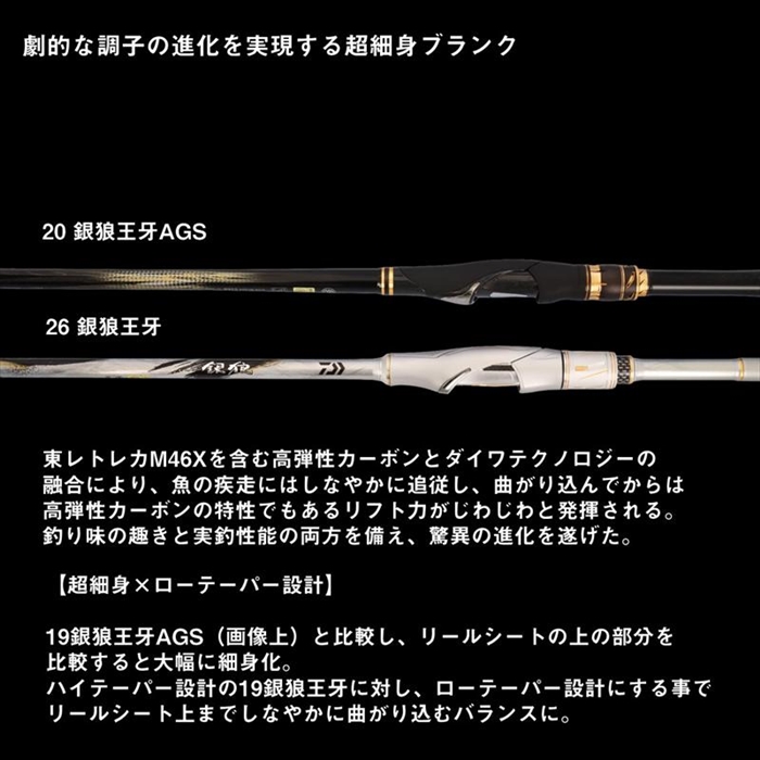 超細身肉厚ブランクと高弾性カーボンが融合した「パワースリムブランク」を纏い、劇的な進化を遂げた新生『銀狼王牙』。高弾性カーボン「トレカ M46X」を採用し、ダイワのロッドテクノロジーで成形することで生み出された細身肉厚ブランクは、シャープな振り調子と風の抵抗を大幅に軽減するシルエットにより、軽快な操作性を実現している。[GINRO OHGA][26new01]