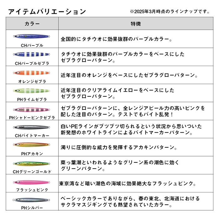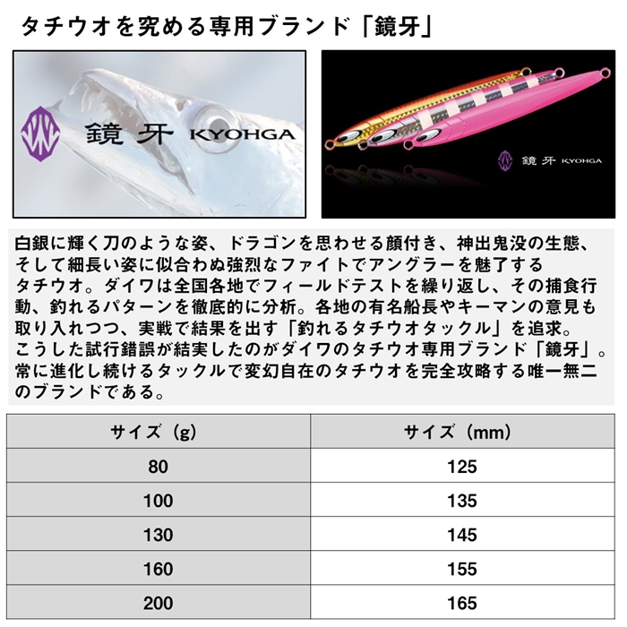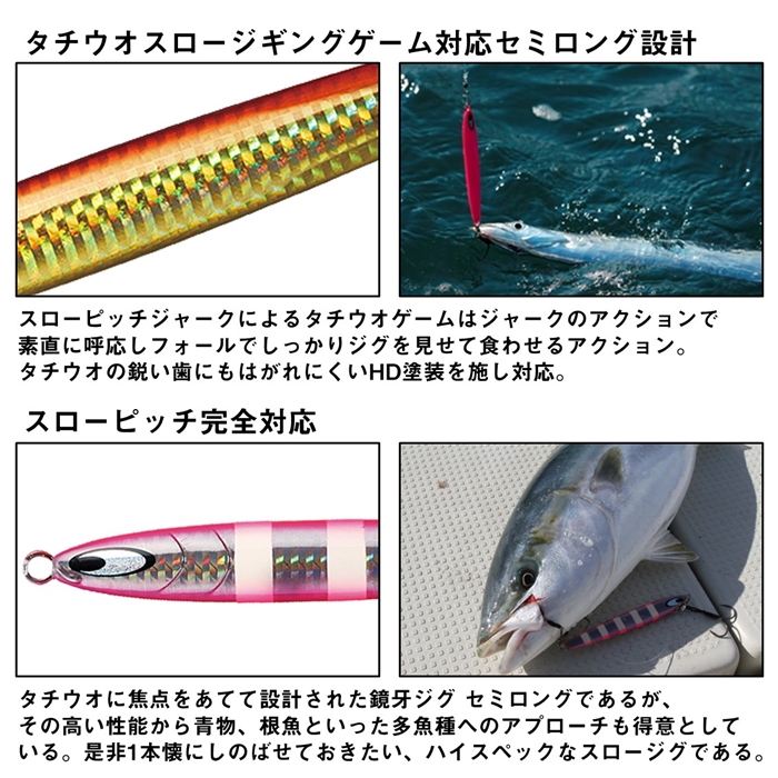 食い渋り時のタチウオの捕食行動を研究し、行き着いた非対称セミロング設計。スローピッチジャークによるタチウオゲームはジャークのアクションで素直に呼応しフォールでしっかりジグを見せて食わせるアクション。タチウオの鋭い歯にもはがれにくいHD塗装を施し対応。フックは鏡牙フックSSツインアシスト&チラシアシストがベストマッチ。(HD塗装:タチウオの鋭い歯にも耐える高耐久塗装処理)[KYOHGA JIG SEMILONG][25new16]