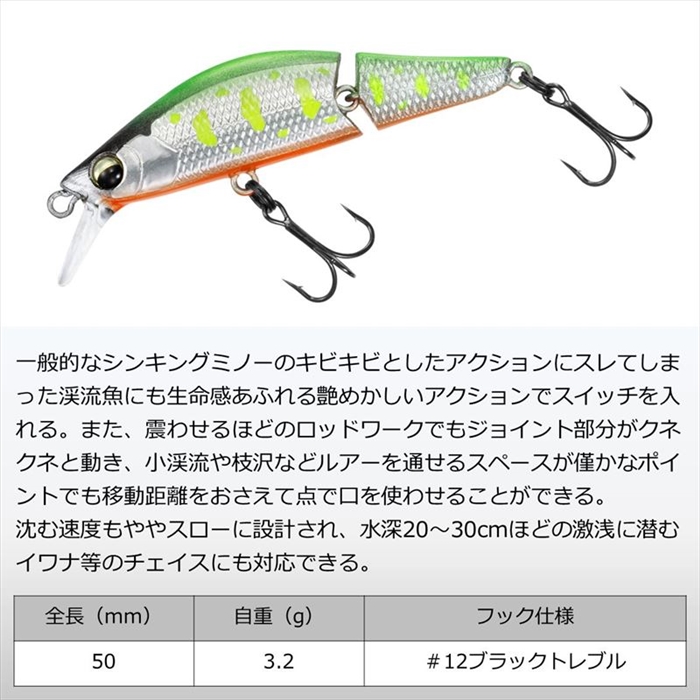 最大の特徴はジョイントボディが演出する艶めかしいクネクネアクション。一般的なシンキングミノーのキビキビとしたアクションにスレてしまった渓流魚にも生命感あふれる艶めかしいアクションでスイッチを入れる。また、震わせるほどのロッドワークでもジョイント部分がクネクネと動き、小渓流や枝沢などルアーを通せるスペースが僅かなポイントでも移動距離をおさえて点で口を使わせることができる。沈む速度もややスローに設計され、水深20cmから30cmほどの激浅に潜むイワナ等のチェイスにも対応できる。[SILVER CREEK MINNOW JOINT][24new16]