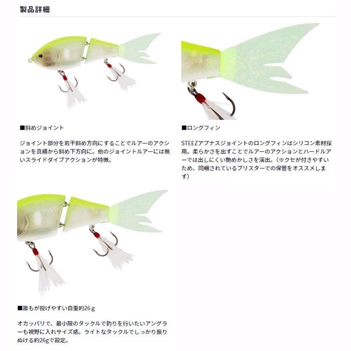 STEEZアプナスジョイントはタフな魚を攻略するために生み出されたフィネスジョイントベイトである。アクションはリップレスながら短い移動距離、短いスライド幅でのドッグウォークアクションを得意としている。通常、リップ付きジョイントベイトの方が短い距離で何度も首を振ることに長けているが、アクションさせた際、リップが水を強く押してしまう為、魚へのアピール力が非常に高く、神経質なバスを攻略しにくい。STEEZアプナスジョイントは、リップレスの為フィネスに誘うことができ、アングラーの操作次第で緩急のあるドッグウォークアクションや水面から水面直下を任意に泳がせることが可能。短い距離でネチネチと誘う際や、素早いドッグウォークで魚の目線から逃がすアクションも高次元でこなすことが出来る。また、シリコンテールはソフト素材を採用。アクションに追従してテールがなびく為、喰わせのタイミングを演出できるのが特徴だ。フロントフックは#4リアフックは#5のフェザーフックを標準装備しているが、狙いたいレンジをもう一段深くしたい場合はフェザー無しのトレブルフックに変更するのがオススメ。ウエイトは約26gで設定。ライトなタックルで使用することができ、オカッパリ等携行タックルを増やしたくないアングラーも重宝するルアーとなっている。[STEEZ APNAS JOINT][24new16]
