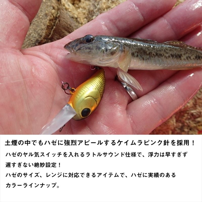 土煙の中でもハゼに強烈アピールするケイムラピンク針を採用!ハゼのヤル気スイッチを入れるラトルサウンド仕様で、浮力は早すぎず遅すぎない絶妙設定!ハゼのサイズ、レンジに対応できるアイテムで、ハゼに実績のあるカラーラインナップ。扁平で丸みを帯びたボディはデッドスローリトリーブでも水を噛んで大きく泳ぎグリグリとリップで水底を掻いて砂煙を巻き上げ、軽快なラトル音とともにアピール。MRはシャローエリアを空気抵抗の少ないリップでロングキャストで狙い、ロングリップのDRはカキ殻エリアなどスタックしやすい場面で使用。ハゼのサイズが小さい初期の段階では一回り小さいJr.がお勧め。[HAZECRA][24new16]