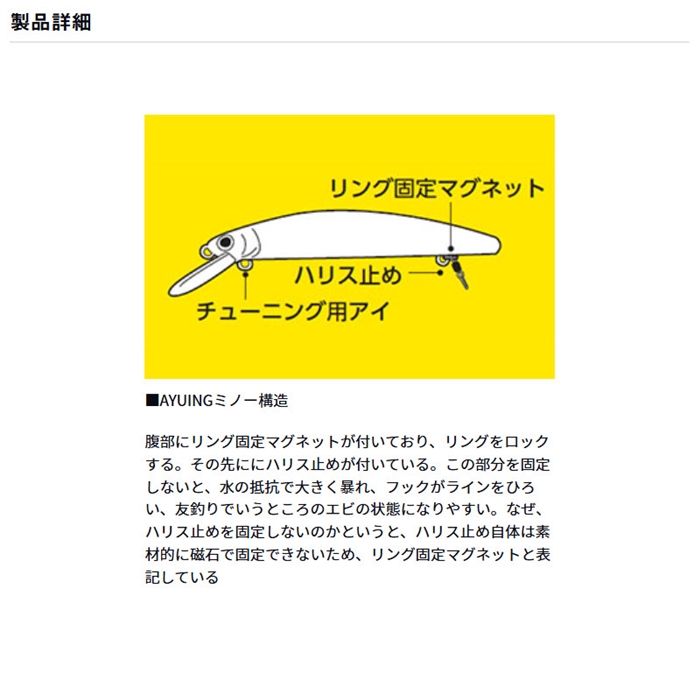 AYUINGミノーが従来のミノーと大きく違う点は、後方アイが腹部についており、その先に自動ハリス止めを用いている点である。こちらのハリス止め部分に友釣り用イカリバリを付けて使用する。また、後方のアイの後ろにはマグネットが埋め込まれており、スプリットリングを固定し、イカリをまっすぐ後方へ垂らす働きをする。リップ裏にもアイが付いており、こちらはシンカーなどを装着し、チューン出来るようになっている。ルアー自体はSF(スローフローティング)モデルのため、テンションを抜くとゆっくりと浮き上がる。この性質を利用し、底で根掛りした時には、テンションを抜いて、根掛りを外すことが出来る。[AYUING MINNOW SF]