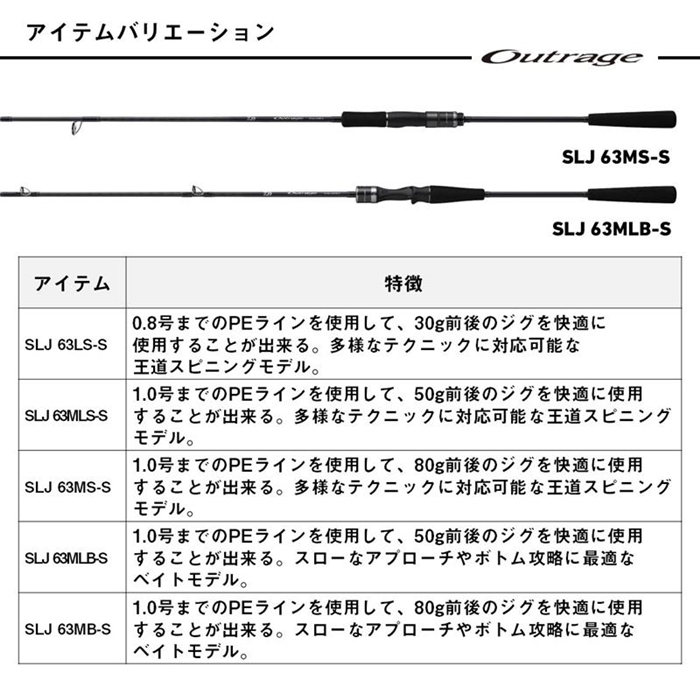グローバルオフショアロッドシリーズ「OUTRAGE XV」。OUTRAGEシリーズならではのロッドアクションを踏襲しながらも、世界中のフィールドに通用するスペック・パワーを持たせたラインナップを展開。本気でターゲットを攻略出来るポテンシャルを備える。その中でもSLJモデルは、シャローエリアや軽量なジグを思い通り操作出来る繊細さと不意の大物にも力負けしないパワーを両立。[Outrage XV SLJ][26new01]