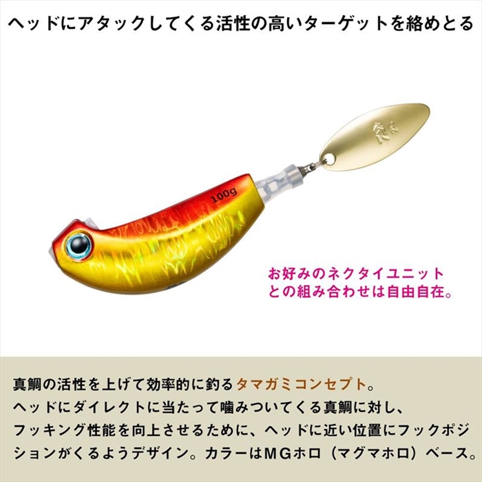 中井一誠氏が提唱する、『真鯛の活性を上げて効率的に釣る』タイラバ新メソッド『玉噛みコンセプト』対応鉛製ヘッド。タングステンとは異なる比重で使い分けることで更なる釣果アップ。MGホロ(マグマホロ)ベースでPHホロベースのタングステンとは、一瞬で区別可能。ブレード付きタイラバヘッドのヘッド単体販売モデル。お好みのネクタイユニットとの組み合わせは自由自在。[KOHGA BLADE BREAKER TAMAGAMI HEAD][24new16]