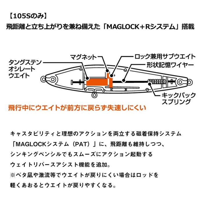 河川やサーフ・磯・干潟などのシャローエリアや水面直下を簡単に攻略できるデイ&ナイト対応シンキング&スイミングペンシル。ジグ並みに飛距離が出るので、ミノーでは届かない遠くのボイルも射程範囲に収める。コノシロ・落ち鮎・イワシ・イナッコ・ハタハタ等様々なパターンに対応。アクションは流れに敏感かつ不規則なスラロームアクション。操作方法は、昼夜に関係なくスローリトリーブのタダ巻きのみ。プレッシャーが高い激戦区のフィールドで使用する時は、ダウンクロスではなくアップストリームキャストをオススメします。流されてくる小魚がシーバスの斜め前に現れるようなイメージでトレースさせるのがコツ。サーフ・磯・漁港・湾奥・都市型河川・河口・干潟・ボイル打ち・そしてピンチな時など、様々なフィールドでお試しいただきたい。[MORETHAN SWITCH HITTER][25new16]