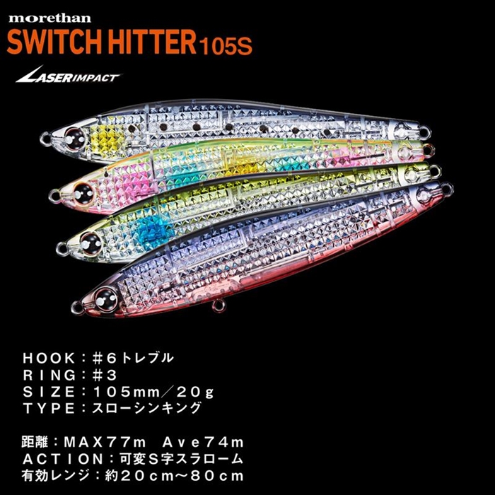 小沼正弥監修モデル。誰でも飛距離が出て扱いやすい!デイ、ナイト、エリアを選ばず良く釣れる!コンパクトぶっ飛びシンペン「スイッチヒッター」が、レーザーインパクト搭載でブラッシュアップ!「この輝きには釣れる理論(ワケ)がある。」レーザーインパクト(PAT.P)搭載。[MORETHAN SWITCH HITTER LASER IMPACT][24new16]