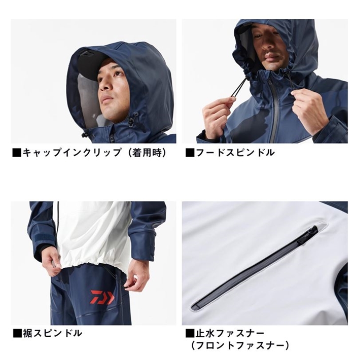海水や汚れが染み込まず、お手入れも簡単で船釣りに最適な素材を全面に採用。フード裏にはクリップ付きで、キャップのつばとクリップを合体することで、フードと頭部の動きを同調して視界を確保。袖口からの浸水を軽減するカフスを内袖に搭載し衣服内の濡れを最小限に抑える。パンツのウエスト両脇にサイズ調整用タブを搭載し、ウエストのフィット感を素早く調整可能。フロントファスナーの三角マチにより、水の浸入を軽減。ずり下がり防止のサスペンダー付き。パンツ内側に収納ポケットを搭載。[25new04]
