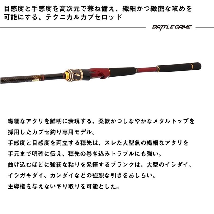 繊細なアタリを鮮明に表現する、柔軟かつしなやかなメタルトップを搭載したカブセ釣り専用モデル。しなやかでありながら感度に優れるメタルトップにより、警戒心の高い大型魚の微細なアタリ、気配をいち早く手元まで伝え、穂先の巻き込みトラブルにも強い。曲げ込むほどに強靭な粘りを発揮するブランクは、大型のイシダイ、イシガキダイ、カンダイなどの強烈な引きをあしらい、主導権を与えないやり取りを可能とした。[BG KABUSE METALTUNE][26new01]