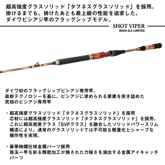 ビシアジ竿に求められる操作性とクッション性を両立。芯材には超高強度グラスソリッド「タフネスグラスソリッド」を採用。これに超高密度グラス「SVFグラス」を融合したソリッドパワースリム構造により、通常のグラスソリッドでは不可能な軽量化とシャープな操作性を実現。更にガイドには『AGS』をフル装備し、手感度と操作性の向上をサポート。また、8:2先調子設定にすることで、自在のコマセワークと即掛け性能を発揮。そして、アジが掛かってからはソリッドならではのクッション性と粘りで、バラすことなく釣りあげるファイトを可能にする。掛けるまでも、掛けたあとも最上級の性能を追求した、ダイワビシアジ竿のフラッグシップモデル。[SHOT VIPER BISHI-AJI LIMITED][26new01]